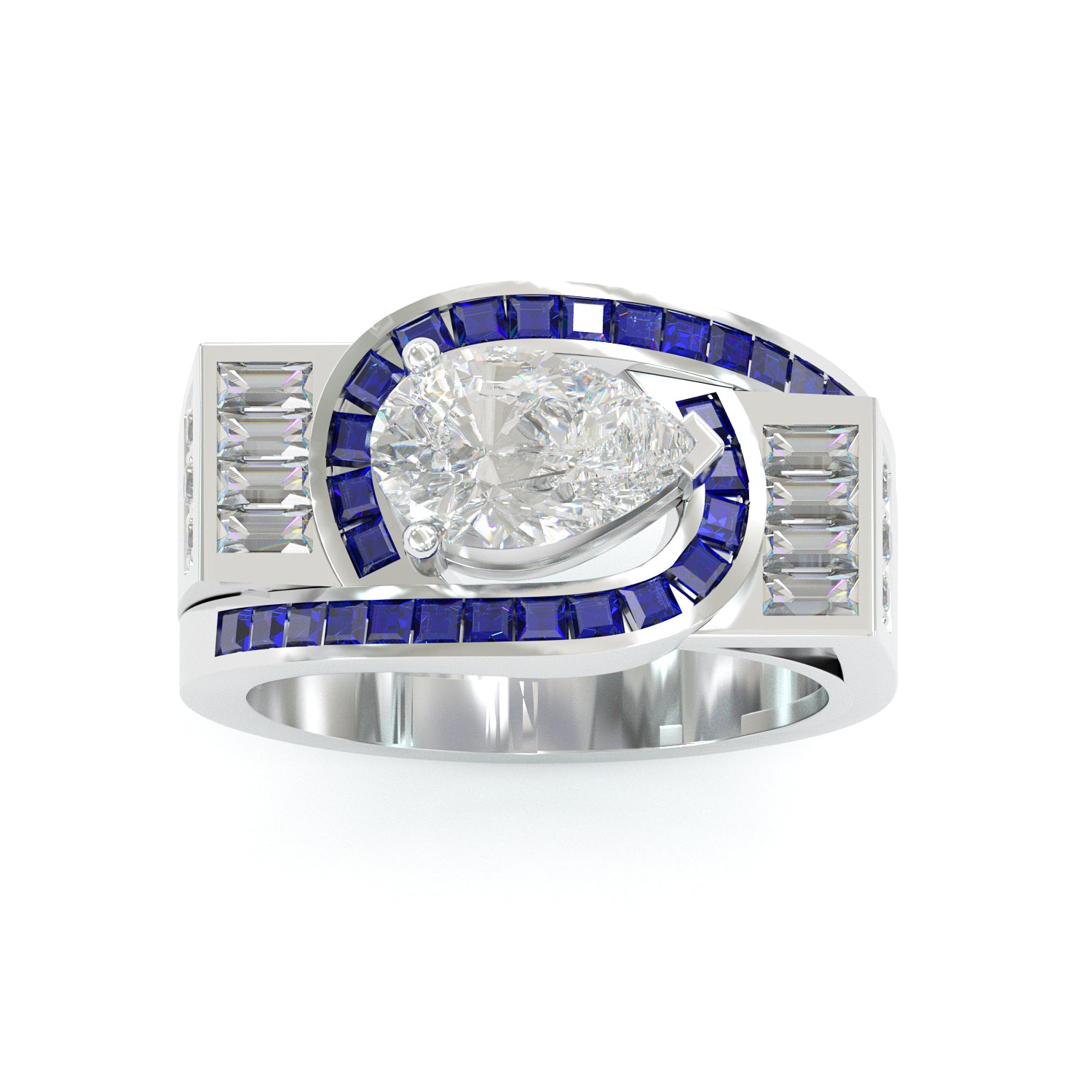 A perfect blend of masculine geometry, sapphire brilliance, and a rare pear-cut centerpiece — ideal for men who love unique, standout luxury.